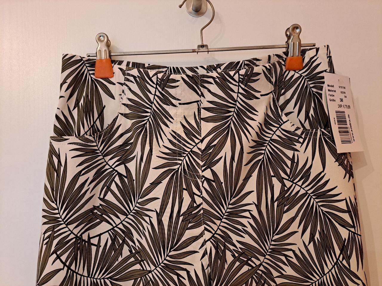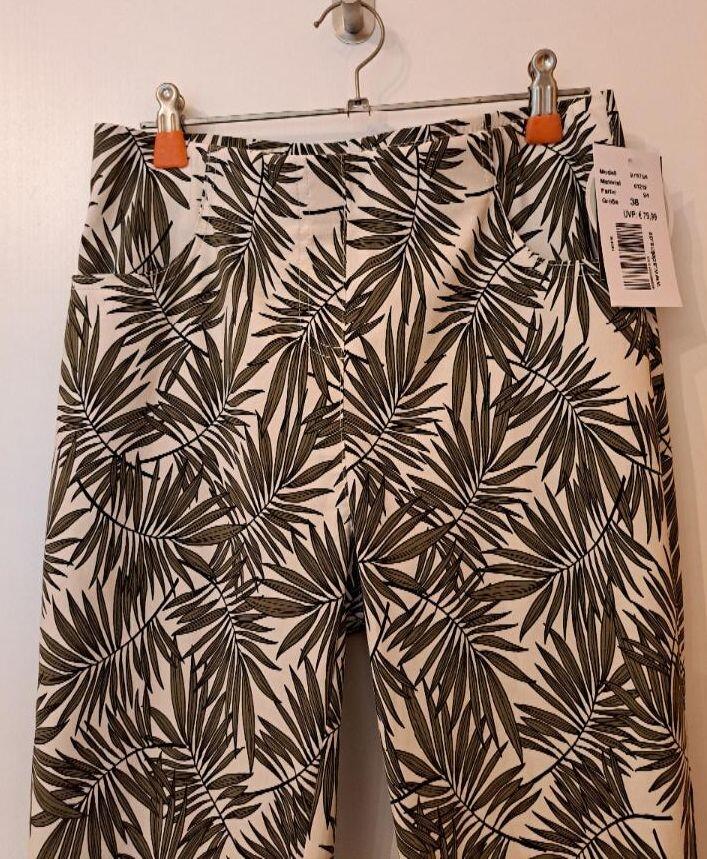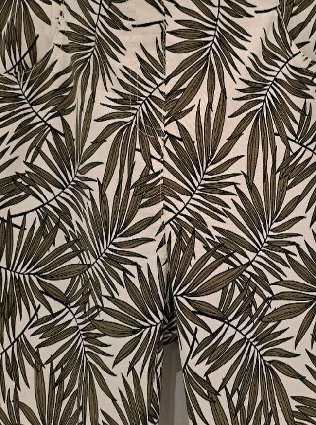 Sie wollen Abwechslung in Ihrem Kleiderschrank ! Dann liegen Sie bei dieser schönen Printhose in Ankleboot-Länge richtig. Es ist die perfekte Hose für den Sommer. Der Print zeigt Farnblätter in schönem Oliv. Kombinieren Sie dazu ein Uni-farbenes Shirt oder einen leichten Sommerpullover und dazu passend noch ein paar schicke Sandalen und schon sind Sie richtig angezogen für den Alltag, im Beruf und im Urlaub.