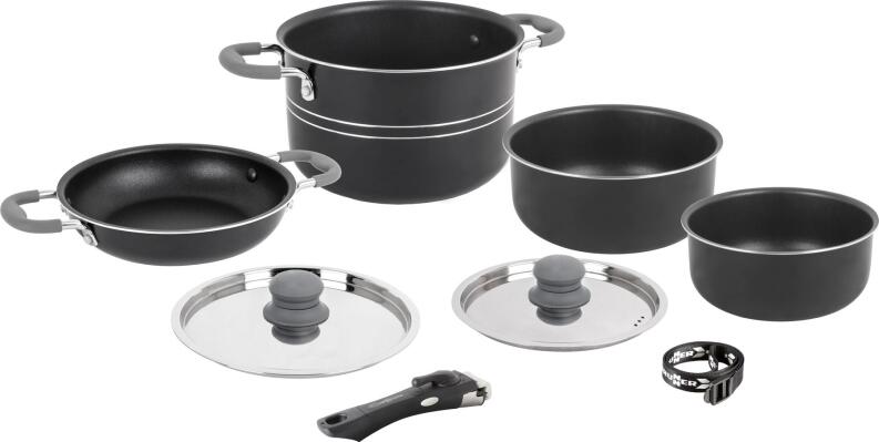 - Set bestehend aus: 1 x Großer Topf Ø 22 cm - 5,3 l, mittlerer Topf Ø 20 cm - 2,5 l, kleiner Topf 16 cm 1,5 ltr., Pfanne mit Griffen Ø 22 cm - 1,8 l, Deckel Ø 22 cm, Deckel Ø 20 cm, 1 x Griffzange, 1 Spanngurt