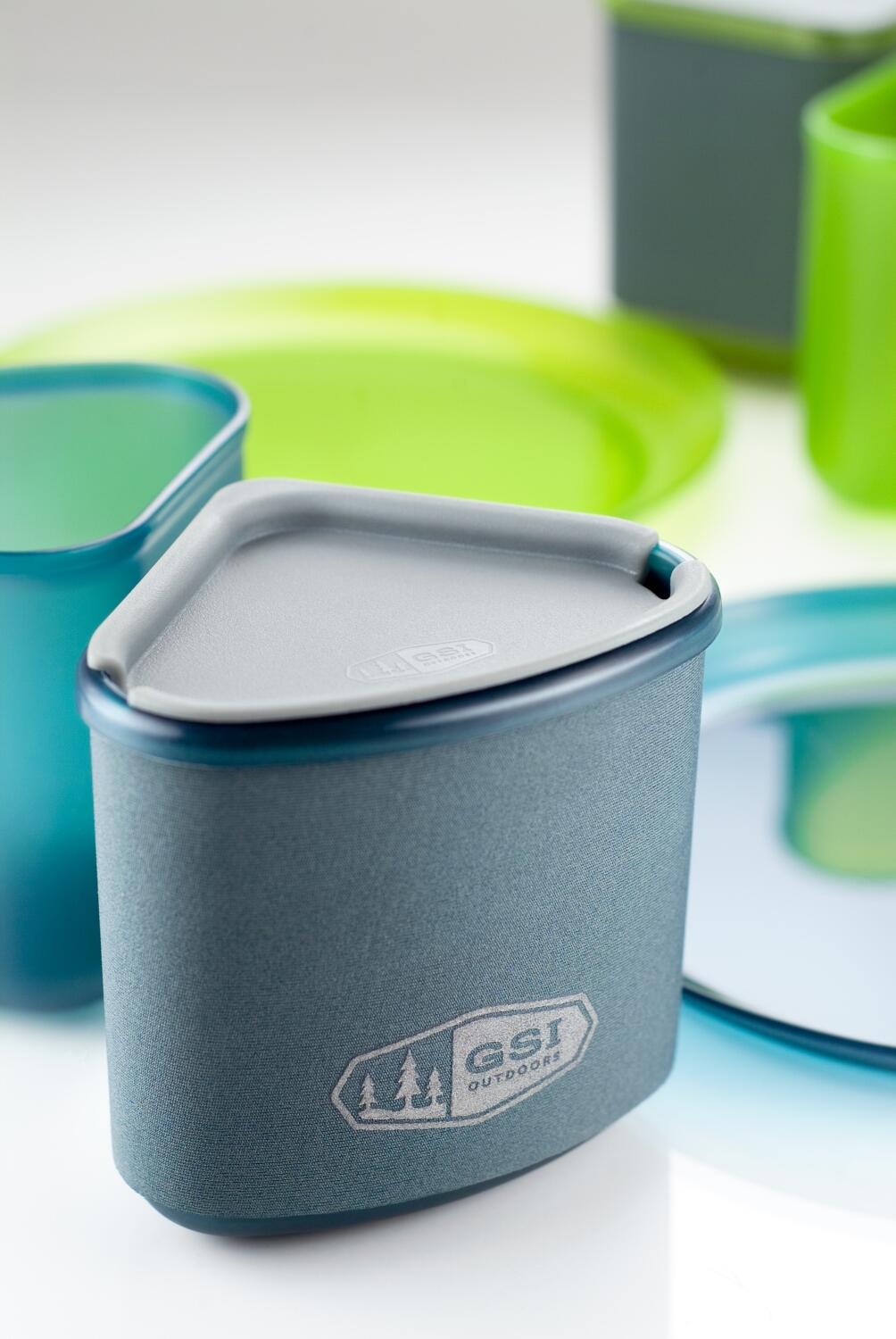 Geschirrset aus dem neuen Infinity Polypropylen (BPA frei) Kunststoff. Extrem kompakt in den Abmessungen und dennoch umfangreich: vier Teller und die farblich passenden Tassen und Schüsseln dazu. Tassen und Schüsseln sind im Dreiecks-Design ausgeführt. Die Tassen (400 ml) sind jeweils mit isolierendem Neoprenmantel ausgestattet und haben einen Durchtrink-Deckel. Sie sind nestbar in den Schüsseln (400 ml). Alles in vier Farben gehalten, um eine Personalisierung zu ermöglichen. So weis jeder welches Set einem gehört und kann dadurch nicht verwechselt werden. Komplett mit Netztransportbeutel. Erstaunlich ist das kompakte Packmass. Dieses Geschirrset passt sogar in viele Topfsets innen rein, sodaß nochmals Platz gespart wird. Auch praktisch fürs kleinere Wohnmobil oder für die Flugreise.